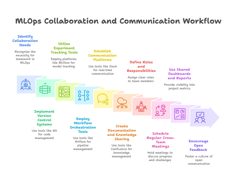 MLOps workflows involve multiple stages—from data preparation and model development to deployment and monitoring—each often handled by different teams. Without seamless collaboration, knowledge silos can form, leading to misaligned goals, duplicated efforts, and delayed deployments. Clear communication ensures that everyone understands project objectives, responsibilities, and timelines.