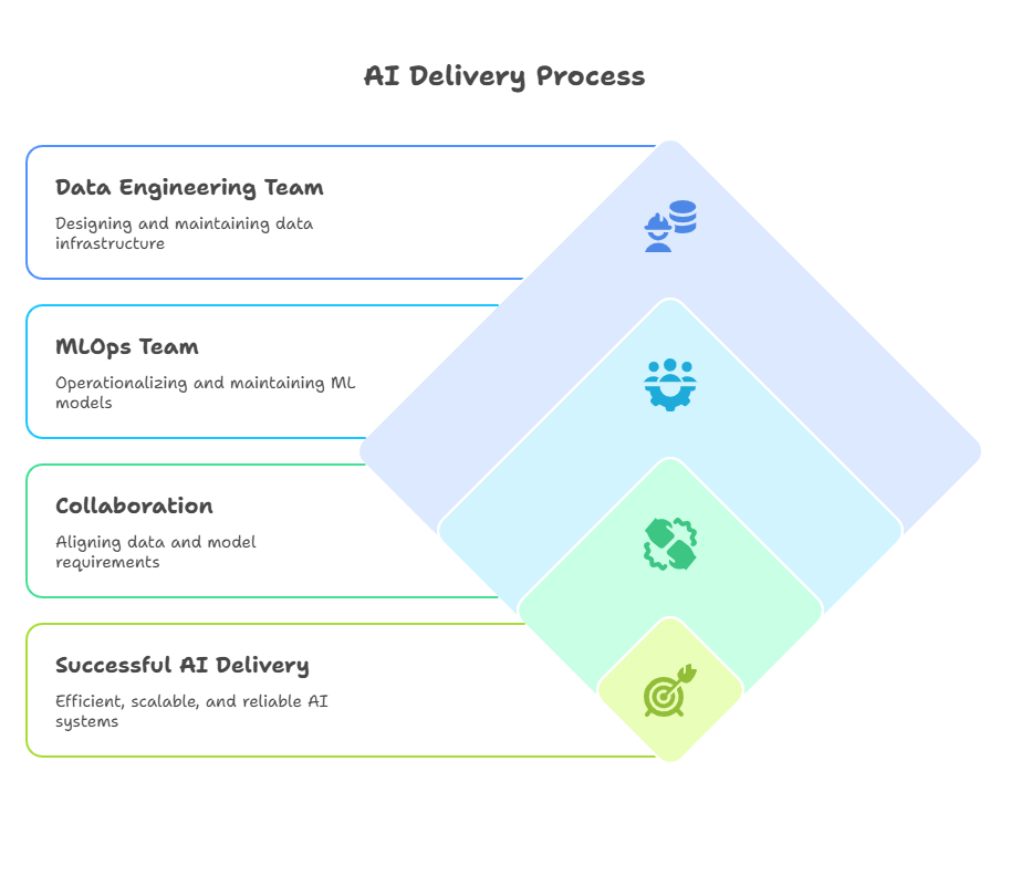 Effective AI delivery requires close collaboration between data engineering and MLOps teams. This includes: