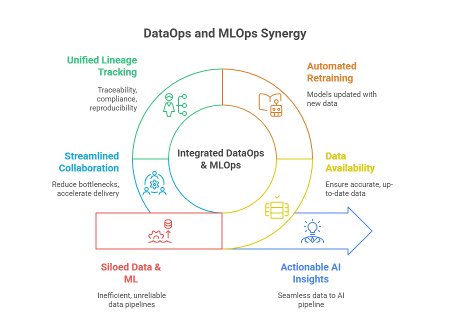 In practice, machine learning models are only as good as the data they consume. If data pipelines are unreliable, slow, or produce inconsistent results, even the best ML models will underperform or fail in production. Conversely, if ML models are not operationalized with best practices, the value of high-quality data is never fully realized. The synergy between DataOps and MLOps ensures that: