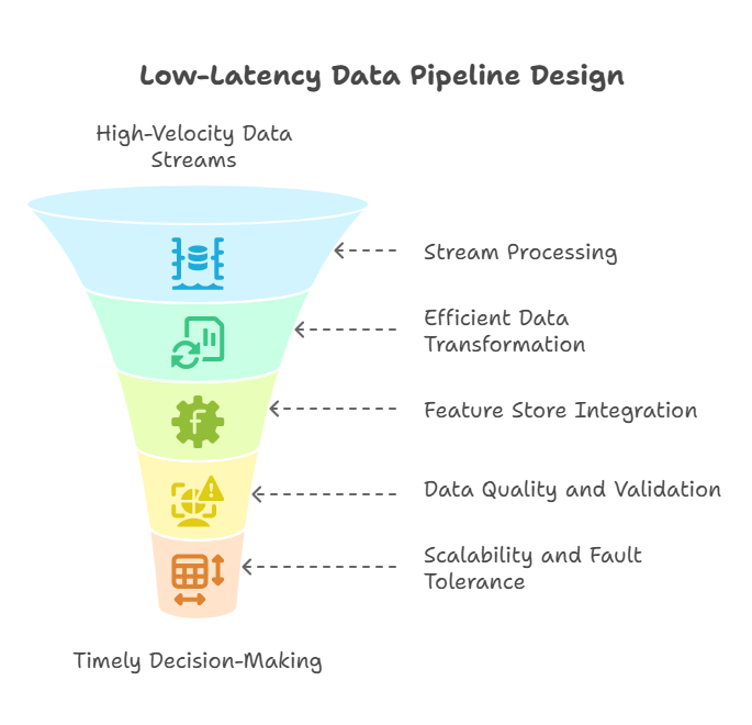 Designing low-latency data pipelines is a critical aspect of real-time MLOps, enabling machine learning models to process and respond to data with minimal delay. These pipelines must efficiently handle high-velocity data streams, ensure data quality, and deliver features to models in near real-time to support timely decision-making.