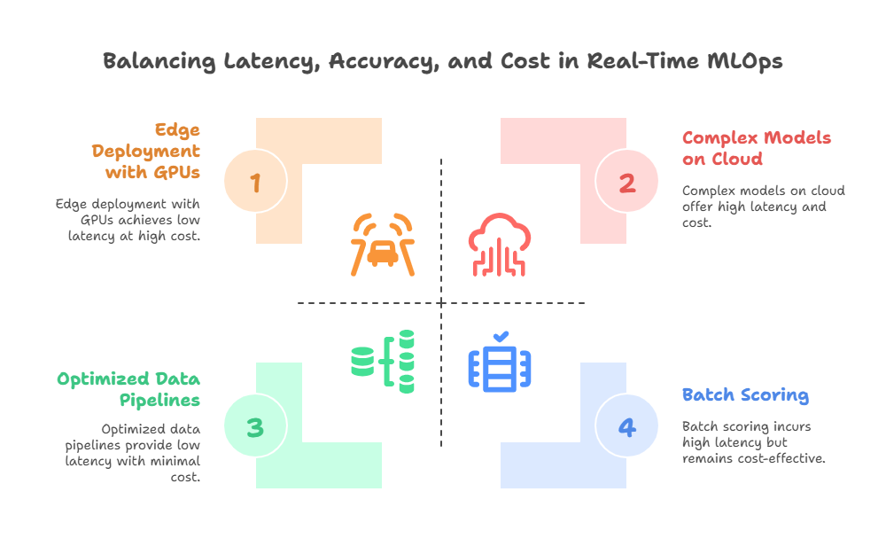 Achieving low latency often involves trade-offs. Highly complex models may provide better accuracy but require more compute time. Similarly, deploying models closer to data sources reduces latency but can increase operational complexity and cost. Effective real-time MLOps balances these factors to meet business goals.