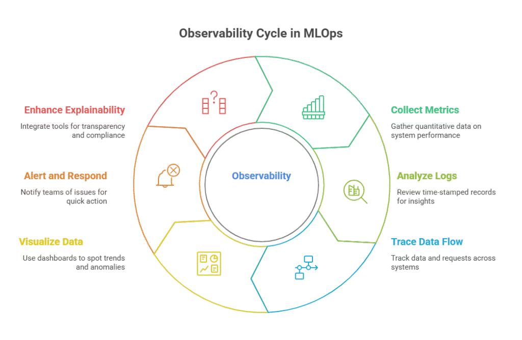 Explainability and Auditability: Integrating explainability tools (like SHAP or LIME) and maintaining audit trails further enhance observability, supporting transparency and regulatory compliance.